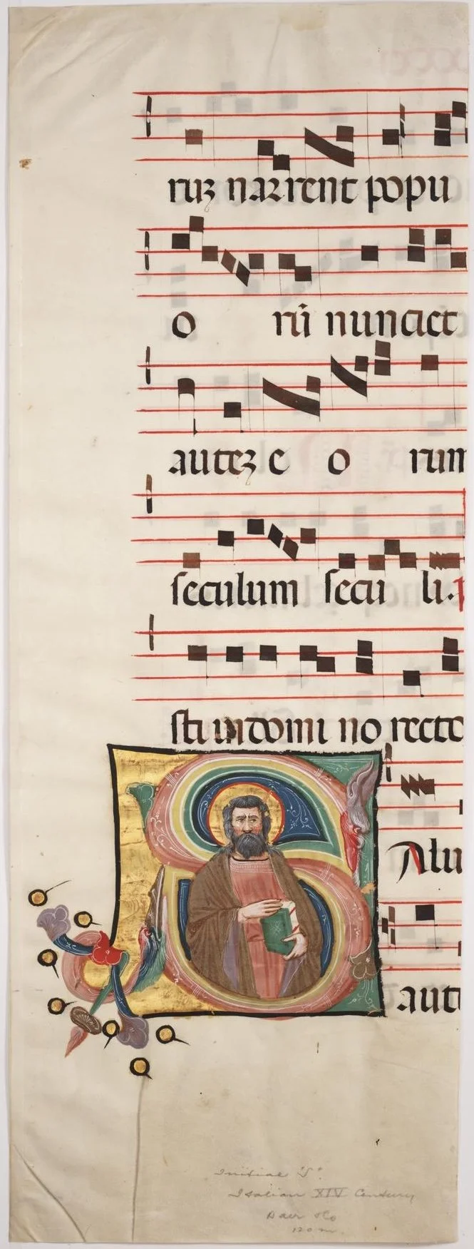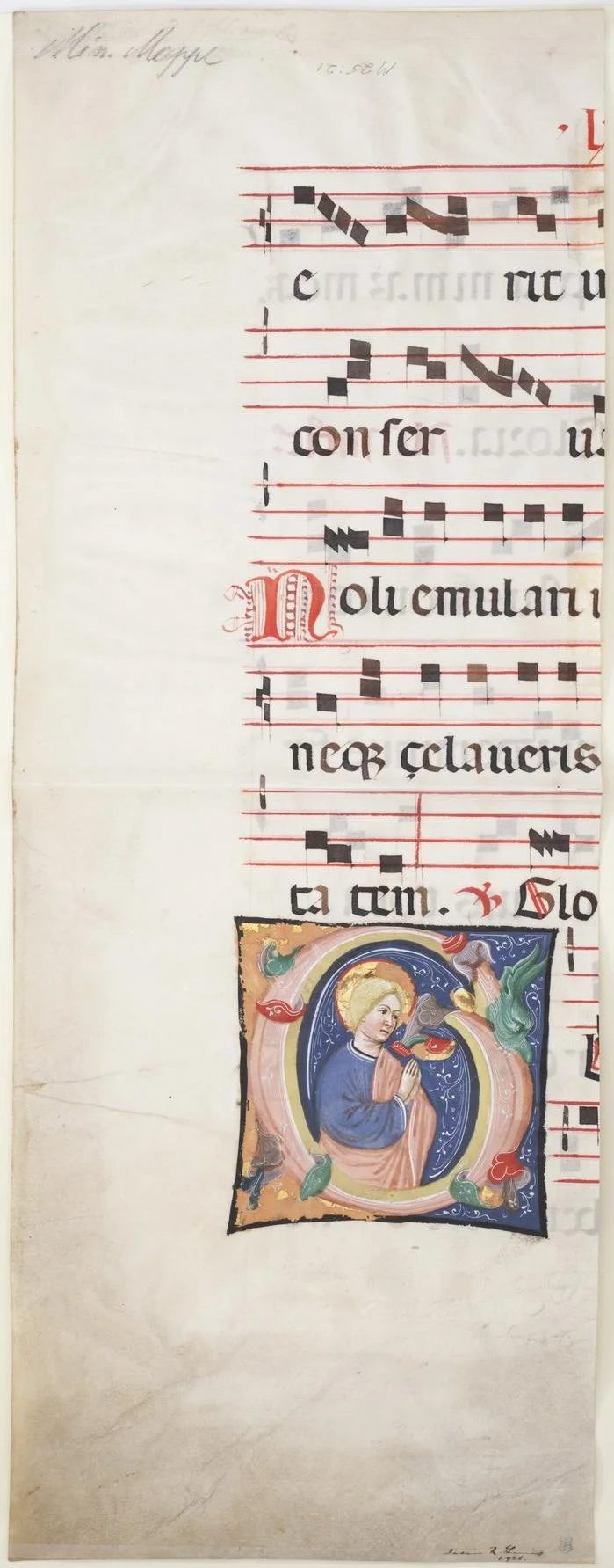 One leaf formerly associated with this group, the Prophet (Isaiah?) once in the Robert Lehman Collection (Sotheby’s, London, 5 December 2012, lot 8; published in Palladino 2003, no. 39) can be excluded, since Palladino clearly identified it as part of an antiphonary rather than a gradual.