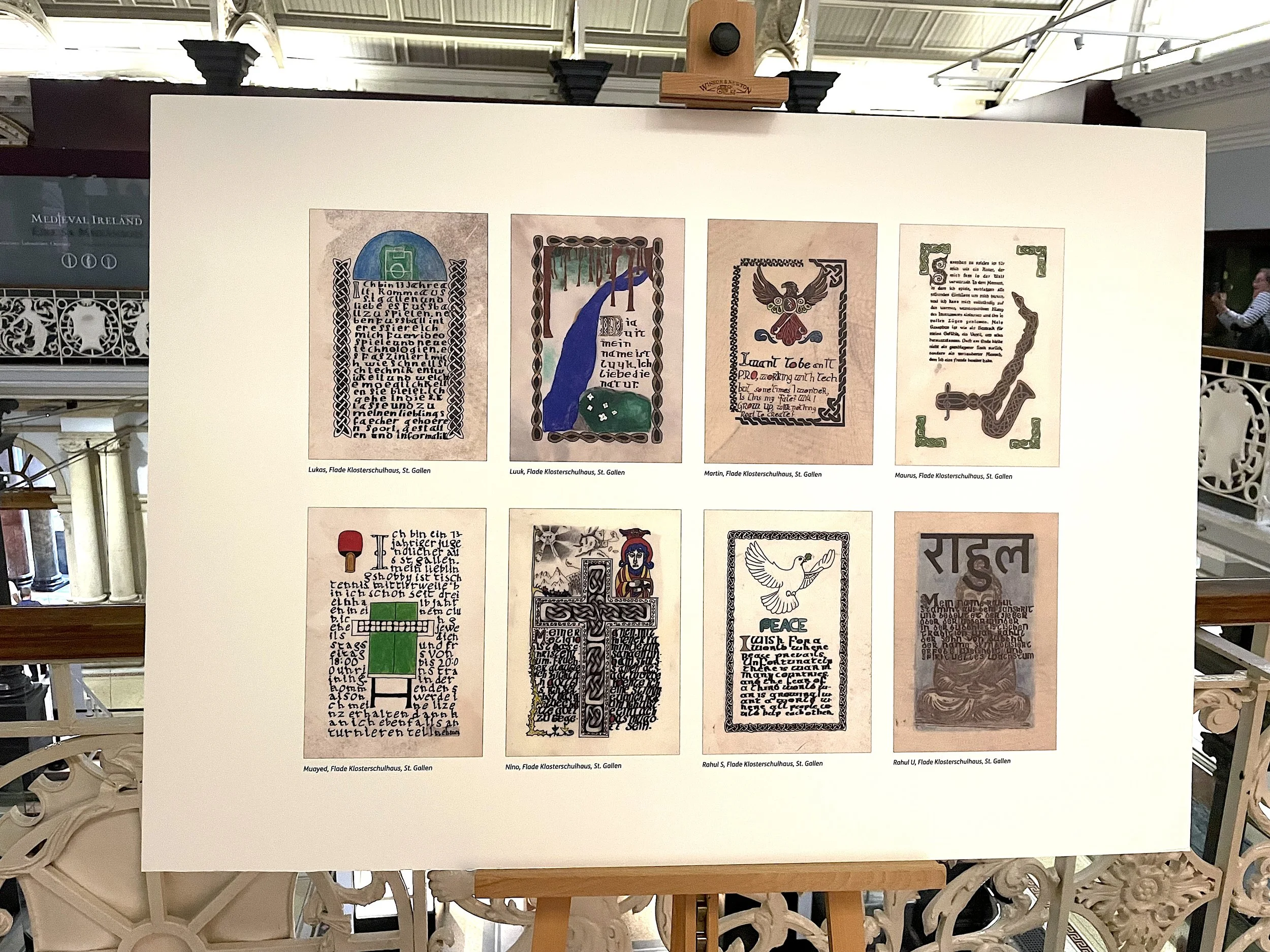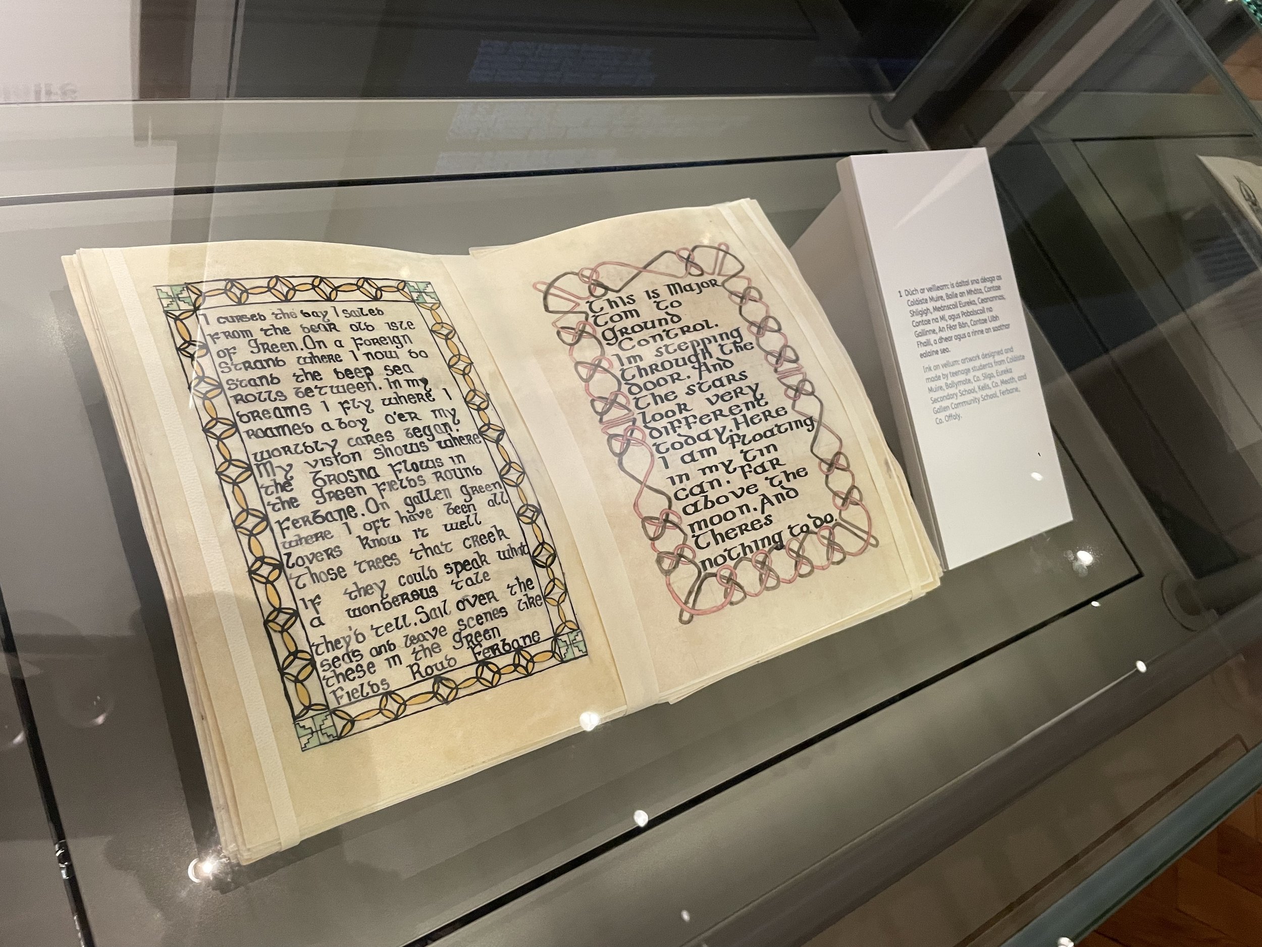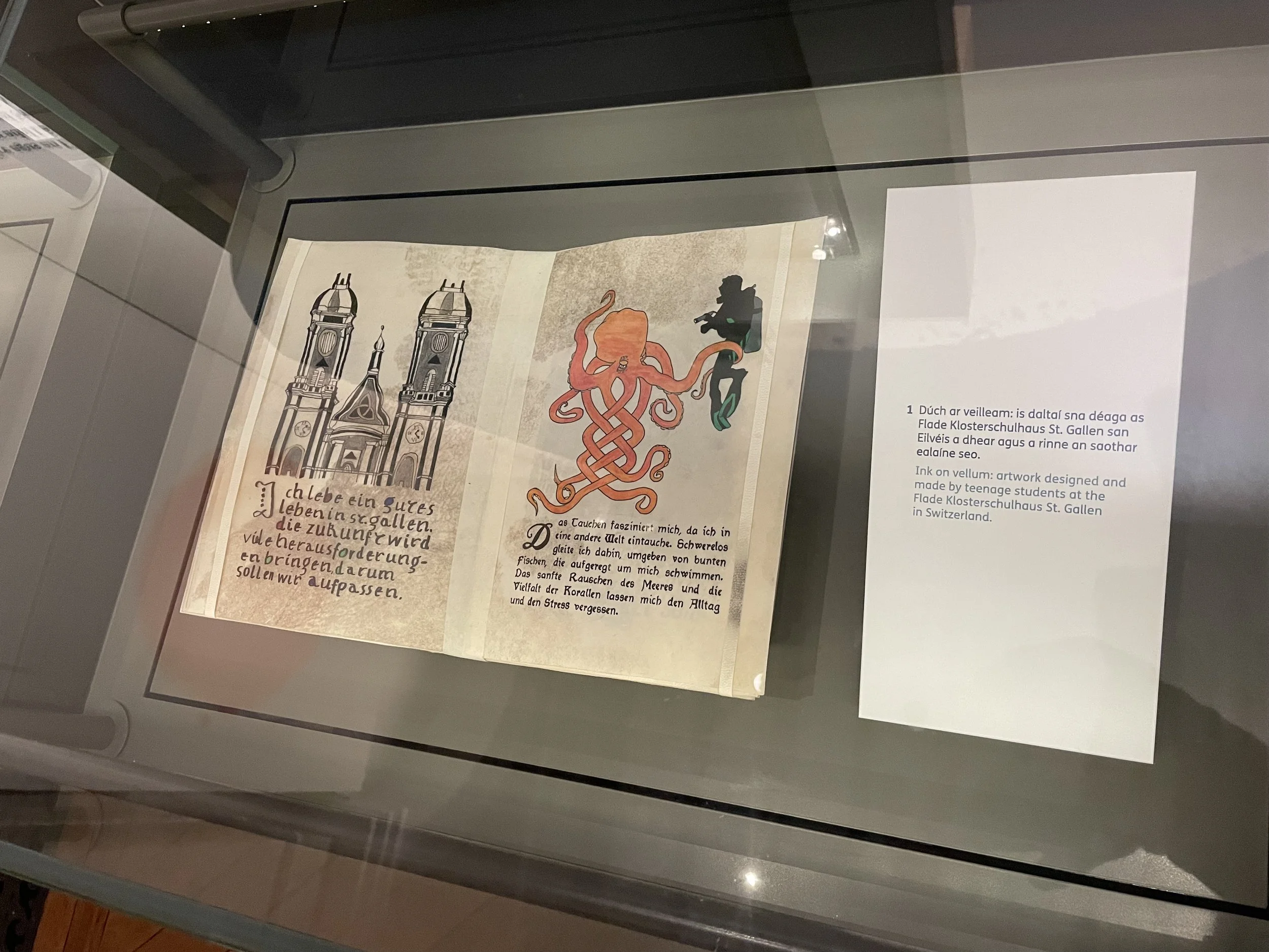 One of the most meaningful surprises in Words on the Wave came at the end of the exhibition: two new manuscript books created by students in Ireland and Switzerland. As part of a collaborative project, teenagers worked with Timothy O’Neill and museum staff to learn medieval techniques—grinding pigments, making ink, and writing in script. Their folios, reflecting themes like nature, poetry, and sport, were technically impressive and emotionally resonant. I photographed several pages, unsure what will happen to these books, but moved by the thought that this centuries-old tradition is still being carried forward by young hands today.