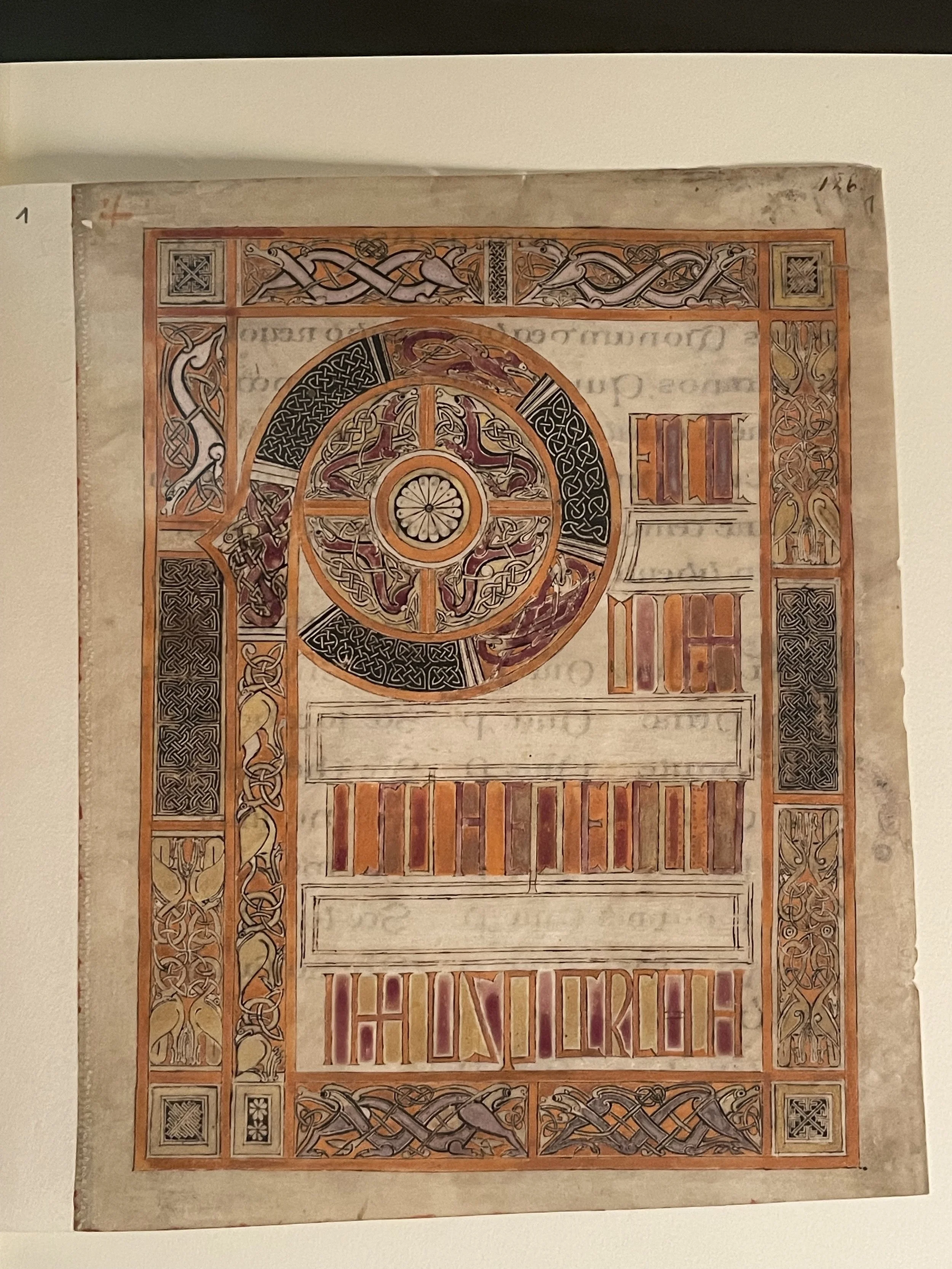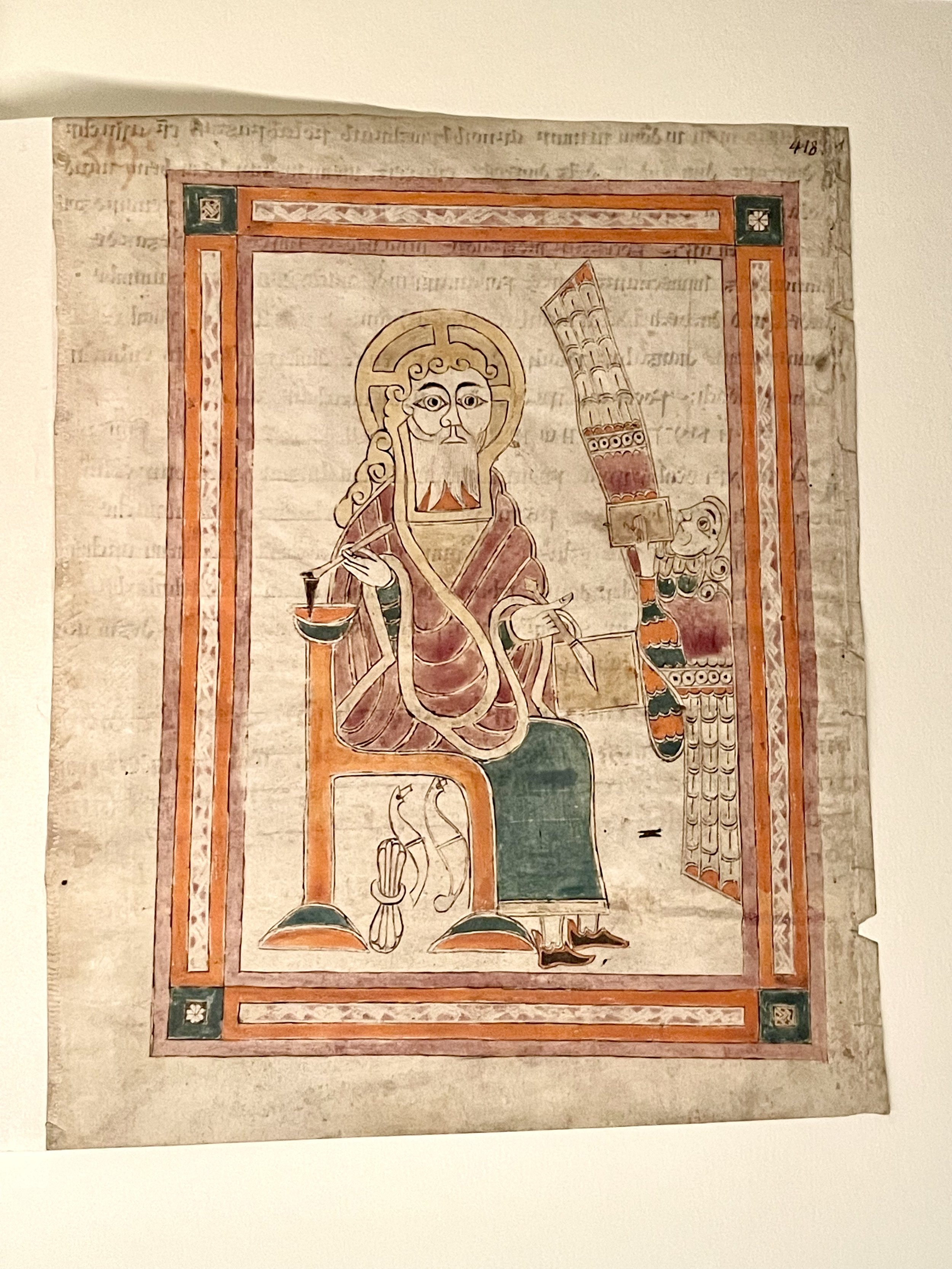 For me the highlights were pieces I’ve admired from afar, like the Irish Gospels of St. Gall, but there were many new discoveries many which lay in the an album of fragments on display (Cod. Sang. 1395) that includes the Peccavimus fragment, a portrait of St. Matthew, and a gorgeous carpet page with a cross packed full of interlace and birds. Also, the wonderful Gospel of St. John that was another surprise. Getting to see them in Dublin was unforgettable.