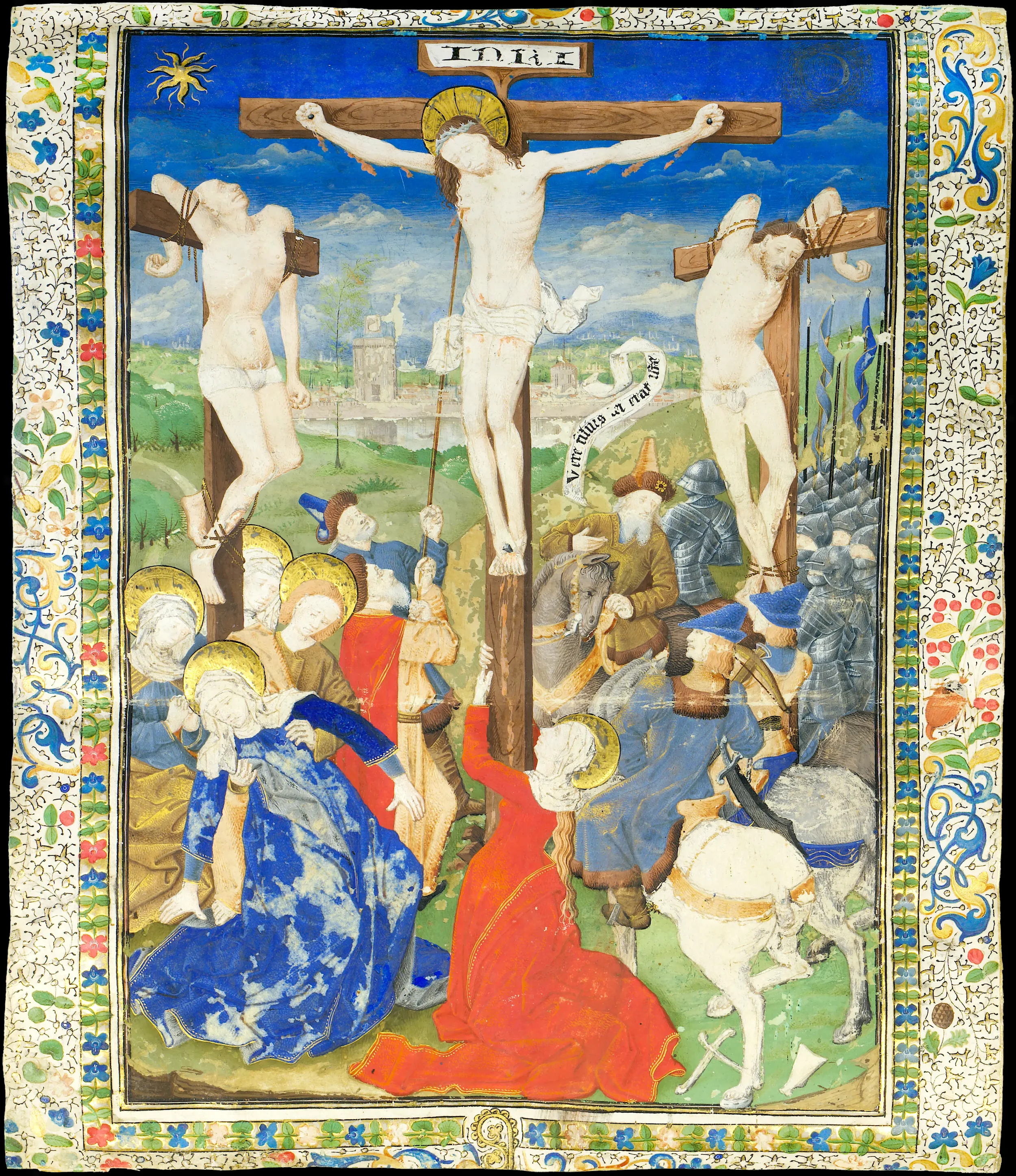 The Master of Jean Rolin II was one of the most accomplished illuminators of his generation. His style reveals the depth of Flemish influence that shaped Burgundian manuscript illumination in the mid-fifteenth century. From Rogier van der Weyden and the Flemish Primitives he absorbed a heightened pathos and dramatic naturalism. Rogier’s monumental Last Judgement polyptych, painted for Nicolas Rolin at Beaune (1443–1451), likely served as a direct point of reference for both Jean Rolin and his illuminator, its solemn grandeur and spatial choreography resonating in the present Crucifixion. Parallels have been drawn with the stage-like compositions of André d’Ypres and the sculptural style of Guillaume Spicre, active in Dijon and later Palermo. Together, these affinities situate the Master of Jean Rolin II within the broader current of Burgundian art, where Flemish panel painting, Burgundian sculpture, and Parisian manuscript illumination intersected to form a richly cosmopolitan style.