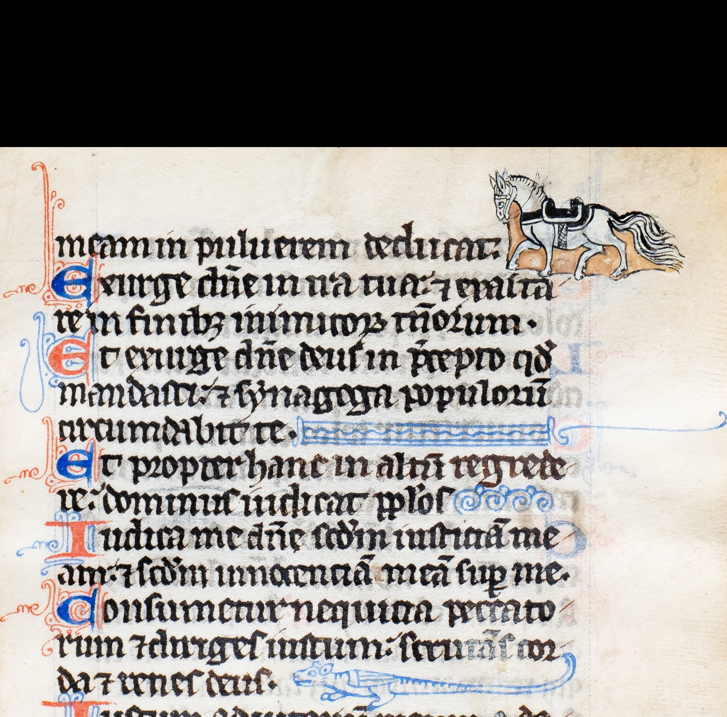 This leaf comes from an extremely early French Book of Hours and is distinguished by whimsical line-fillers and a delightfully painted marginal horse. Saddled and harnessed, with its bridle, straps, and tack carefully detailed, the tiny figure charges into the text with striking energy—an unusual and charming feature for a manuscript of this date, and all the more remarkable for the extraordinary detail lavished on so small a motif. Painted by a Parisian illuminator at a time when Paris stood at the very center of luxury manuscript production in Europe, the leaf embodies the refinement and inventive spirit that made Parisian Books of Hours prized across the continent.